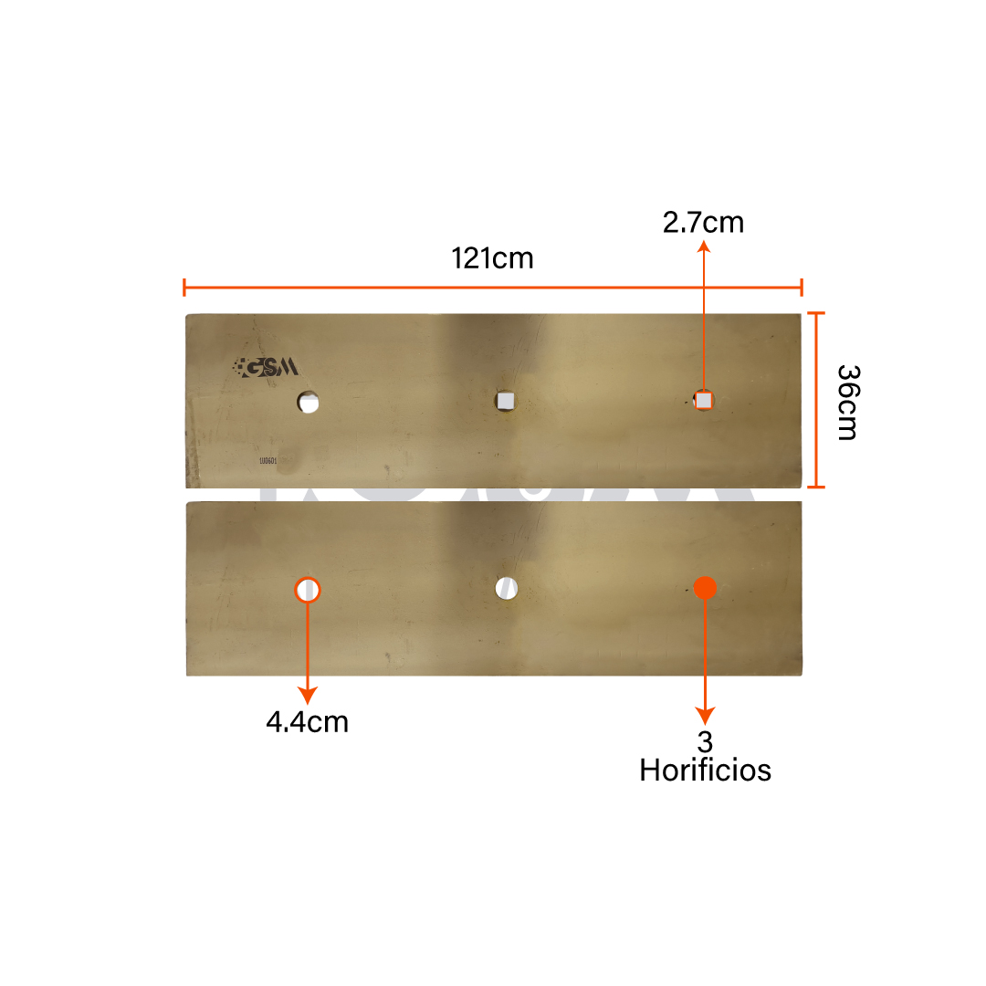 Cuchilla de carga central 1,21 m x 36 cm x 3 cm con 3 perforaciones de 1” T. Resistente, durable y fácil de instalar para minería y construcción.