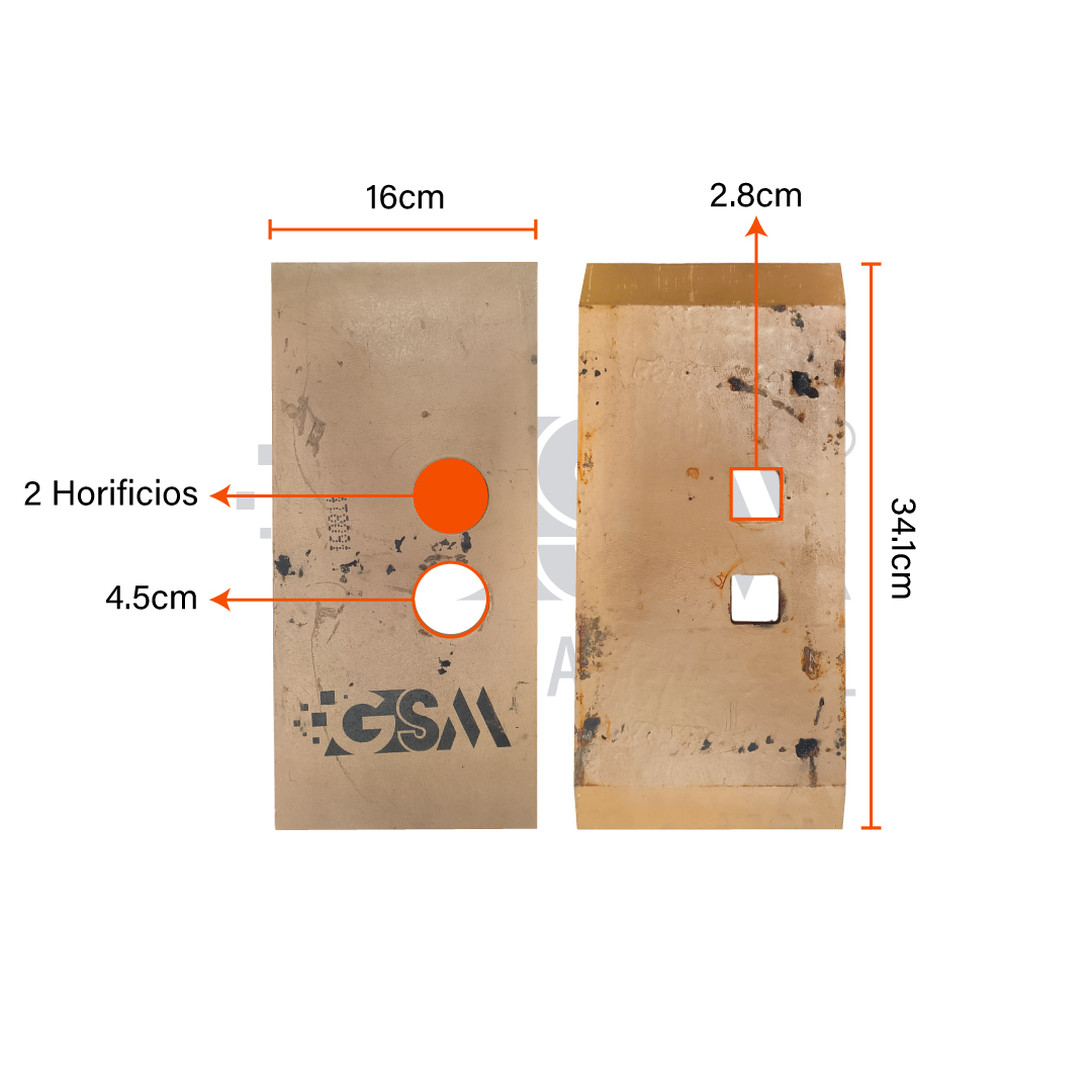 Cuchilla de carga esquinera 34 x 16 x 2,5 cm con 2 perforaciones de 1” T. Resistente, compacta y fácil de instalar para construcción y minería.