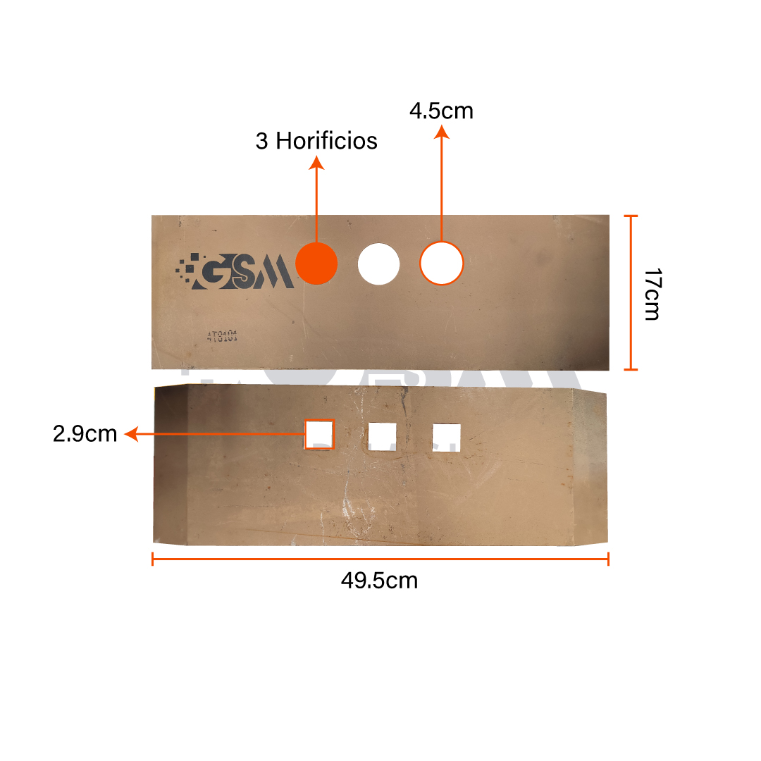 Cuchilla de carga esquinera 49,5 x 17 x 3 cm con 3 perforaciones de 1” T. Resistente, durable y fácil de instalar para construcción y minería.